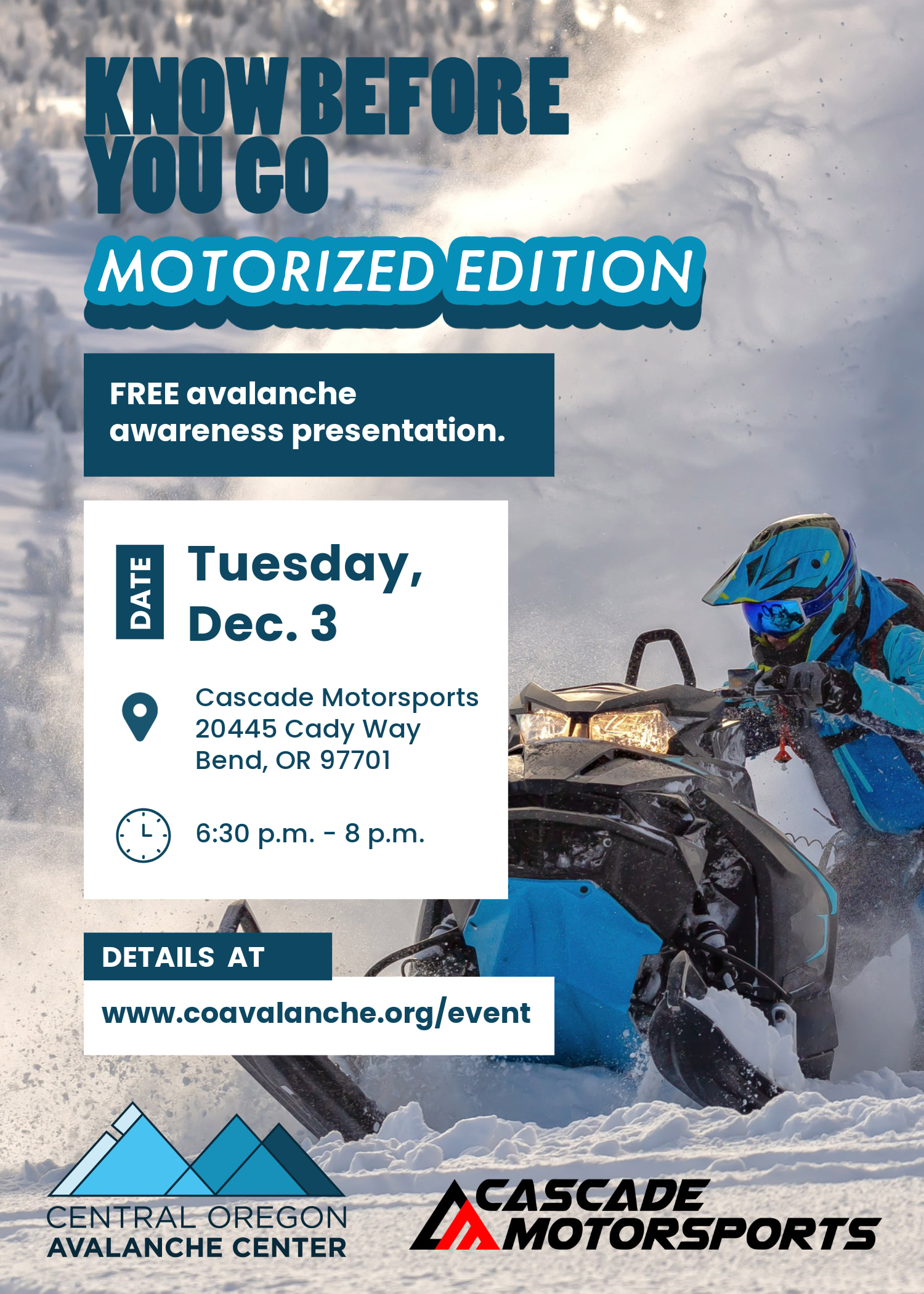 Learn about the destructive power of avalanches, safety equipment, how people get in trouble, and the basics of how to avoid them. In line with COAC’s mission of increasing avalanche awareness and safety in Central Oregon, this presentation will provide a good foundation for learning about backcountry travel or is an excellent refresher for more experienced backcountry users.
